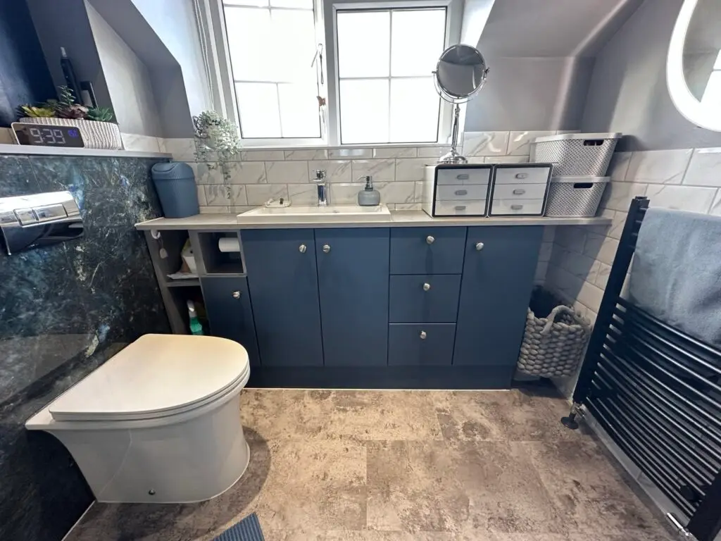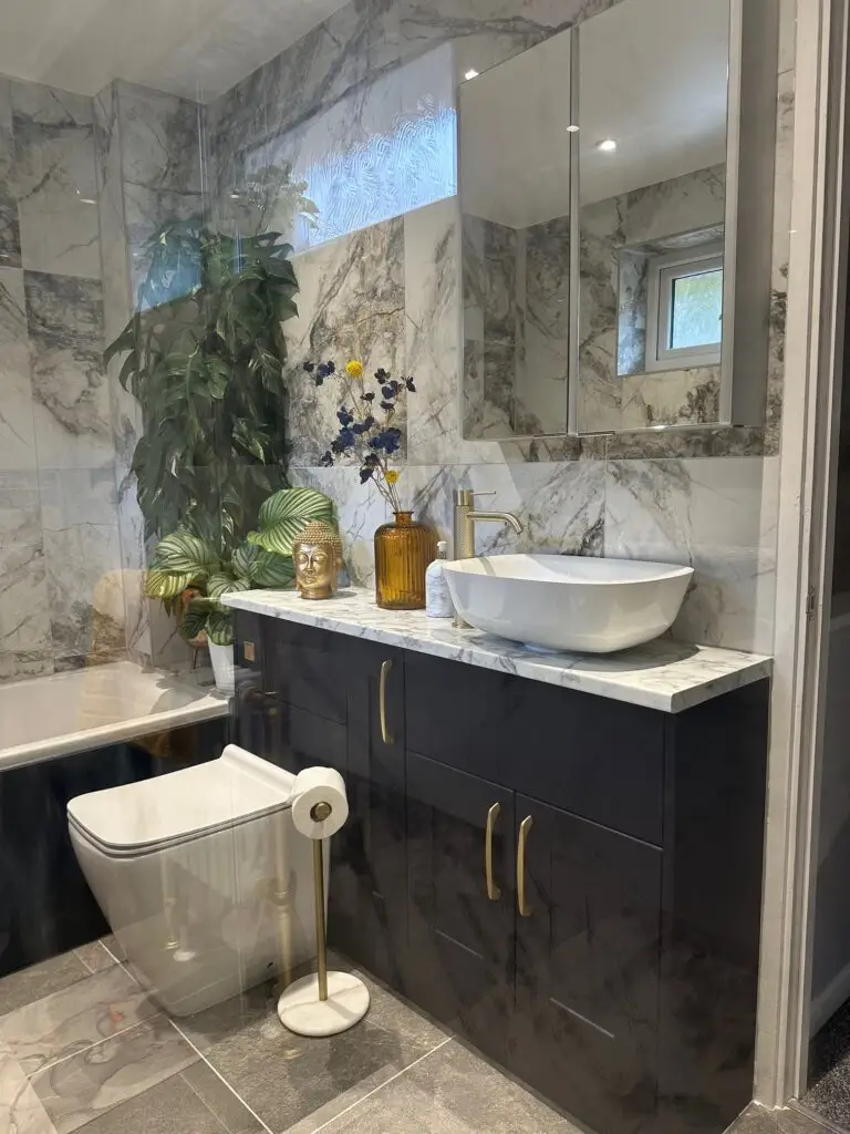 The deep navy vanity unit adds rich contrast while gold accents — from the fixtures to the accessories — introduce warmth and sophistication. A frameless glass shower with brushed gold hardware keeps the space feeling open and airy, while the large format tiles create a sense of luxury and continuity.