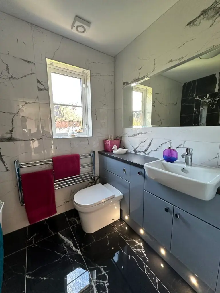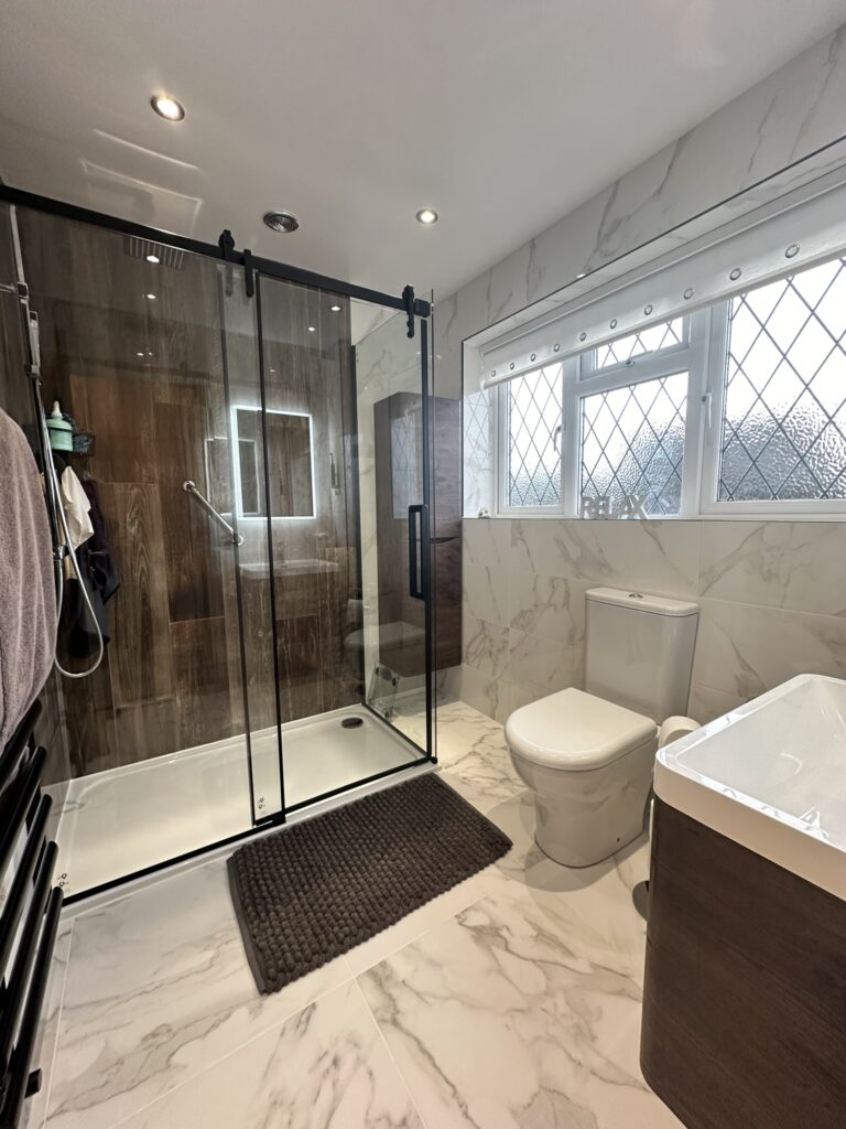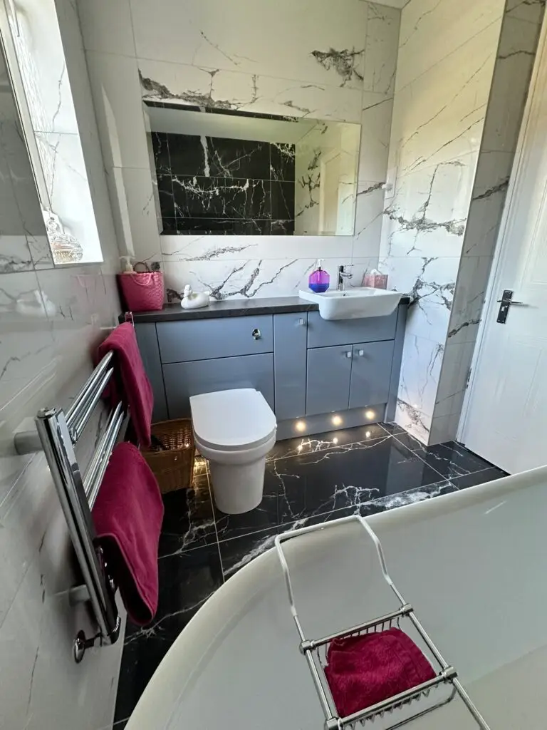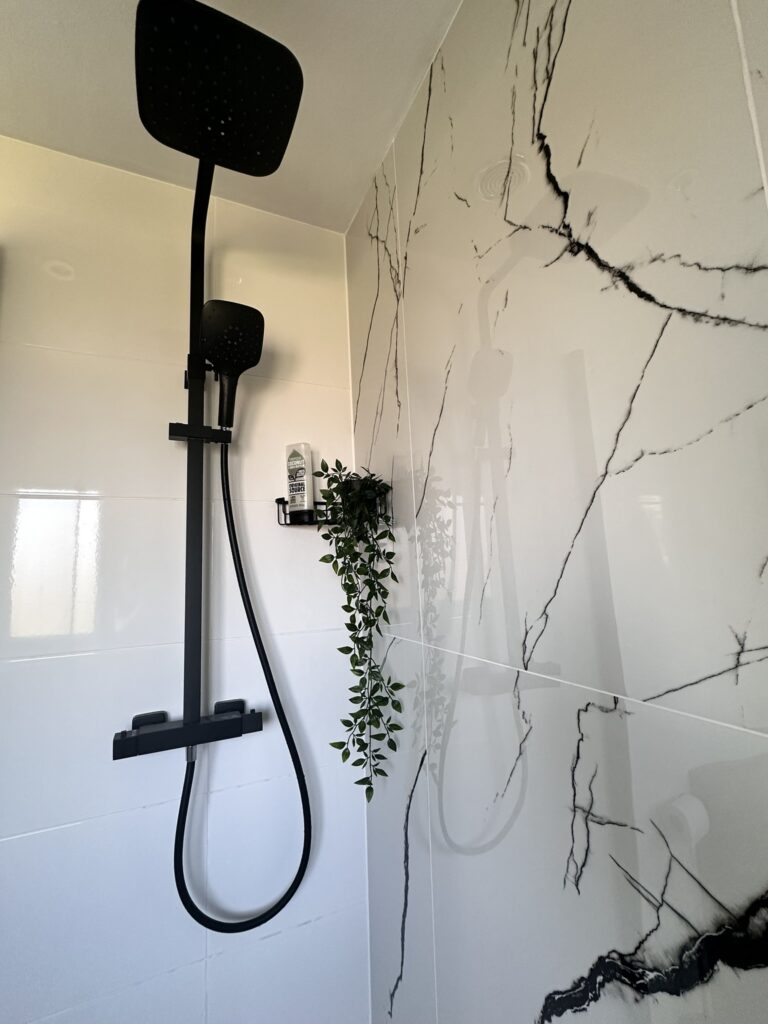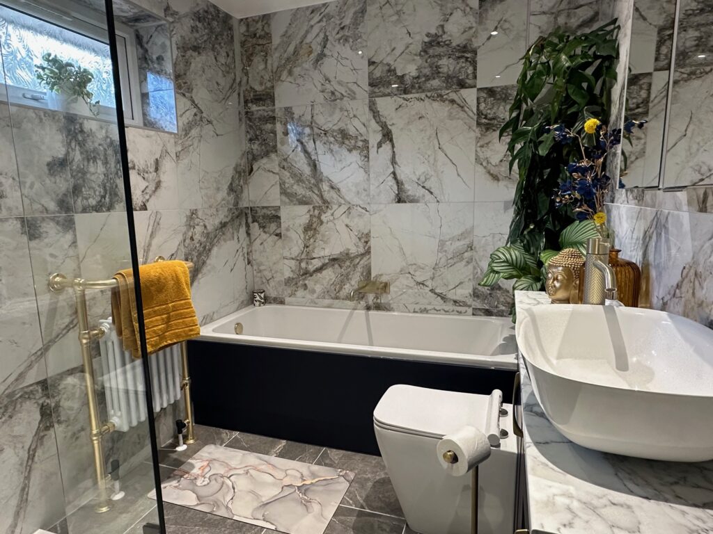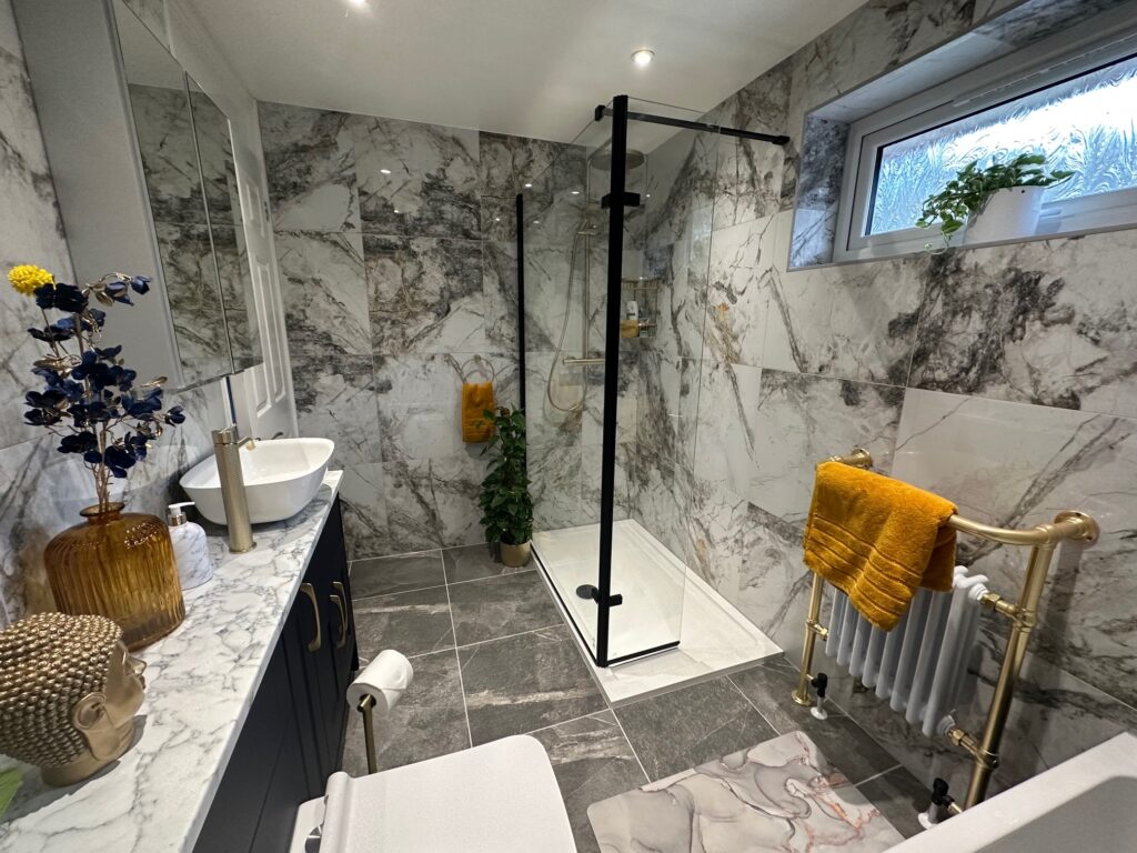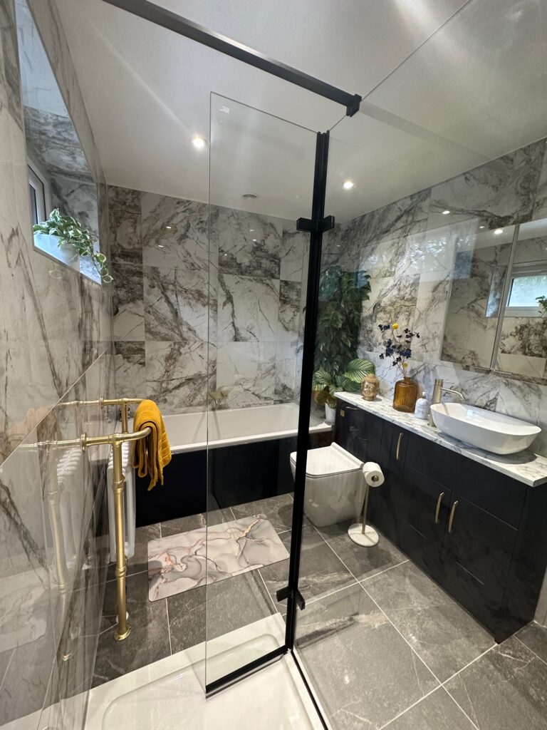 This bathroom transformation, titled Golden Veins, is a masterclass in elegance and texture. Featuring dramatic marble-effect tiles with striking veining, this space combines natural beauty with bold design choices.