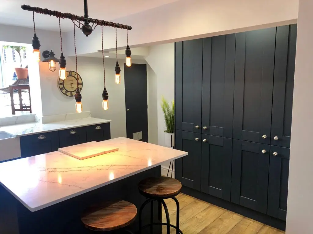 In one example, a sleek navy shaker door pairs beautifully with pristine white quartz countertops, complemented by a rich warm oak floor, creating a look that’s both timeless and modern.