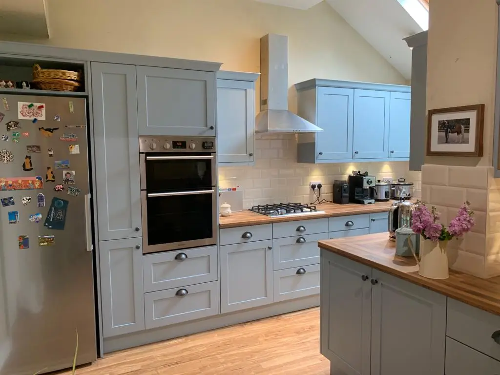 In another design, the soft hue of light duck egg blue shaker doors is elegantly contrasted with natural wooden tops, bringing a calming, classic feel to the space.