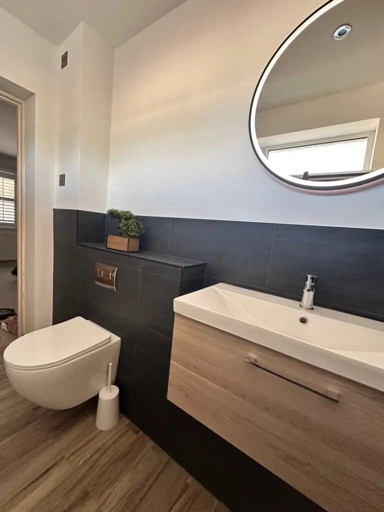 Welcome to this sleek and stylish ensuite bathroom, expertly designed to transform a long, thin, and unused space into a modern sanctuary.