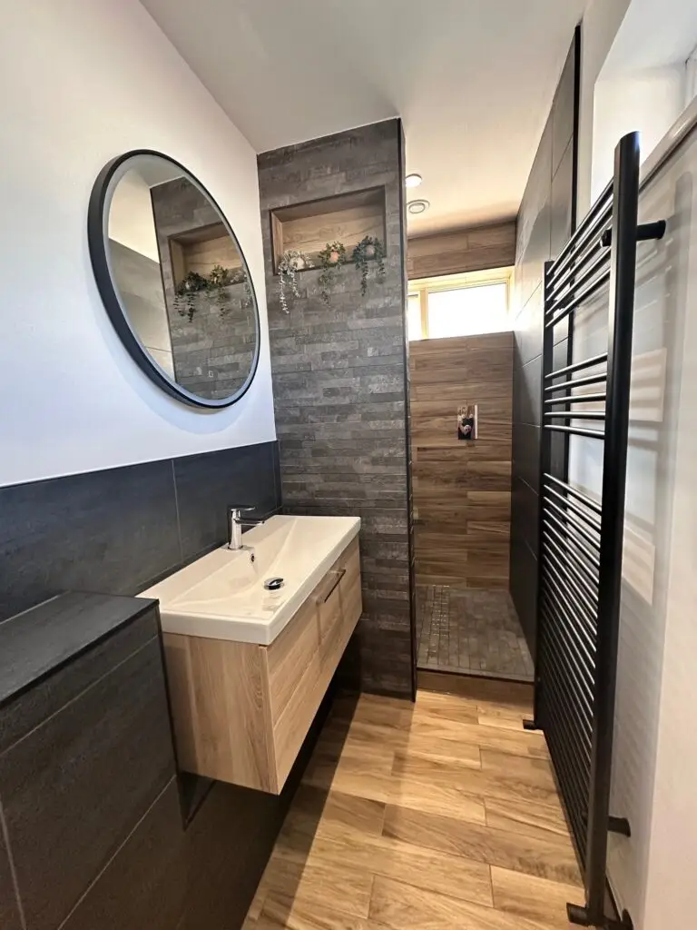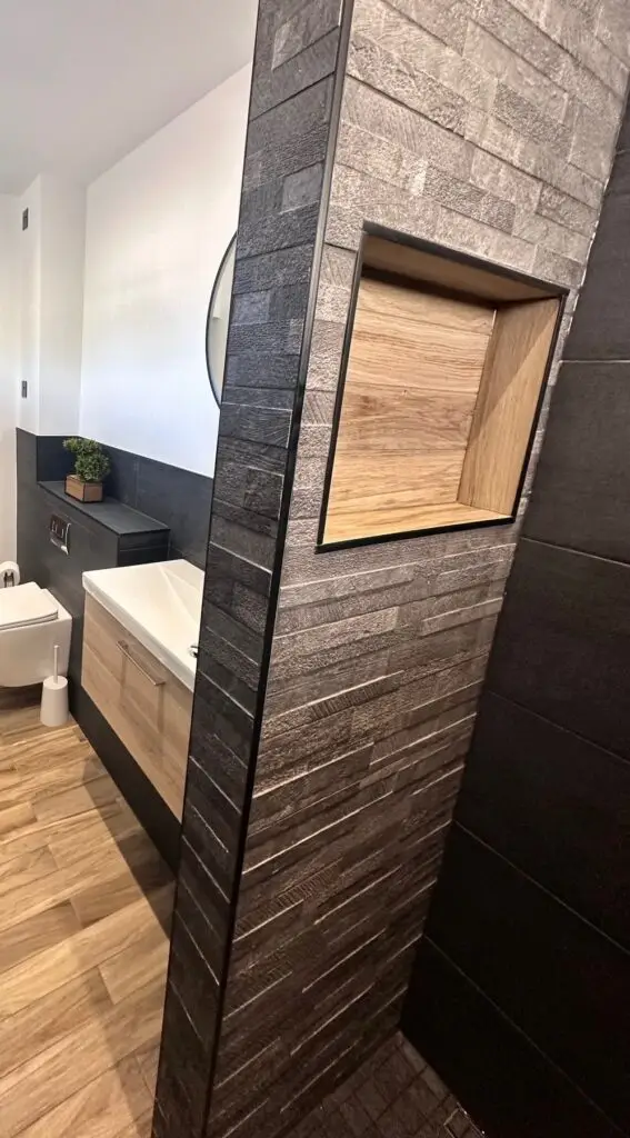 The floor and walls are clad in dark grey slate tiles, creating a sophisticated and bold base. The rustic split-face tiles add an intriguing texture and contrast, while warm wooden tiles on the floor and feature wall provide a touch of natural charm — balancing the cooler tones and giving the room a cozy, welcoming atmosphere.
